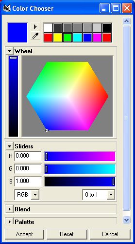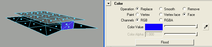 Double click the colour box to the right of 'Color Value' to set the desired colour, and then click 'Flood' to assign this colour to the currently selected faces.