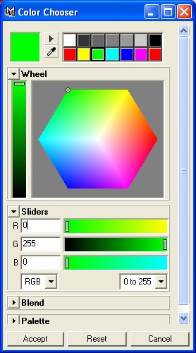 To mark this first terrain layer, simply set the colour to full green (red=0, green=255, blue=0), as shown here.